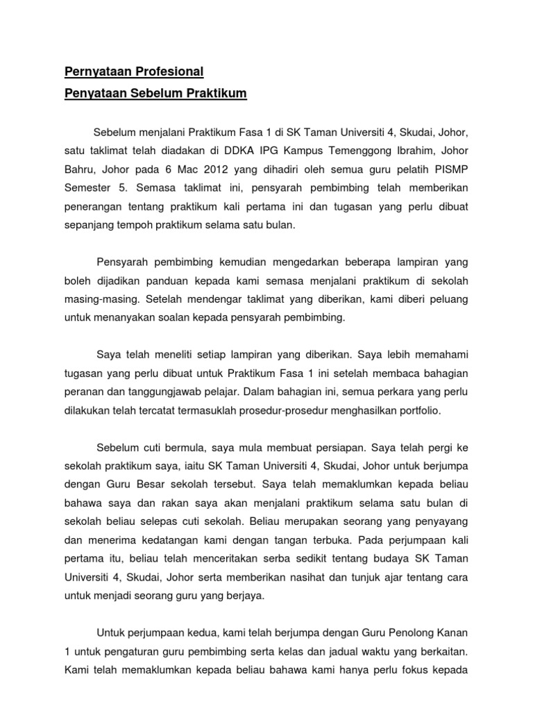 . Pengalaman semasa menjadi guru sandaran tidak terlatih selama 4 tahun sebelum ini diharap. Pernyataan Profesional Praktikum Fasa 1 Pdf Doc Penyataan Profesional Full Hazwani Yusof Academia Edu 105275954 Pernyataan Profesional Doc Penyataan Profesional Sebelum. Pernyataan Profesional Praktikum Fasa 1 Hardeli M Si Ananda Putra M Si Ph D Dr.